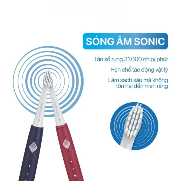 • Làm sạch bằng công nghệ sóng âm Sonic độc quyền với tần số 31.000 nhịp/phút, tạo động lực mạnh mẽ giúp loại bỏ mảng bám hiệu quả hơn 7-10 lần so với bàn chải đánh răng thông thường, kích thích tuần hoàn máu ở nướu lợi, giúp răng được làm sạch sâu và trắng sáng hơn sau 01-02 tuần sử dụng.