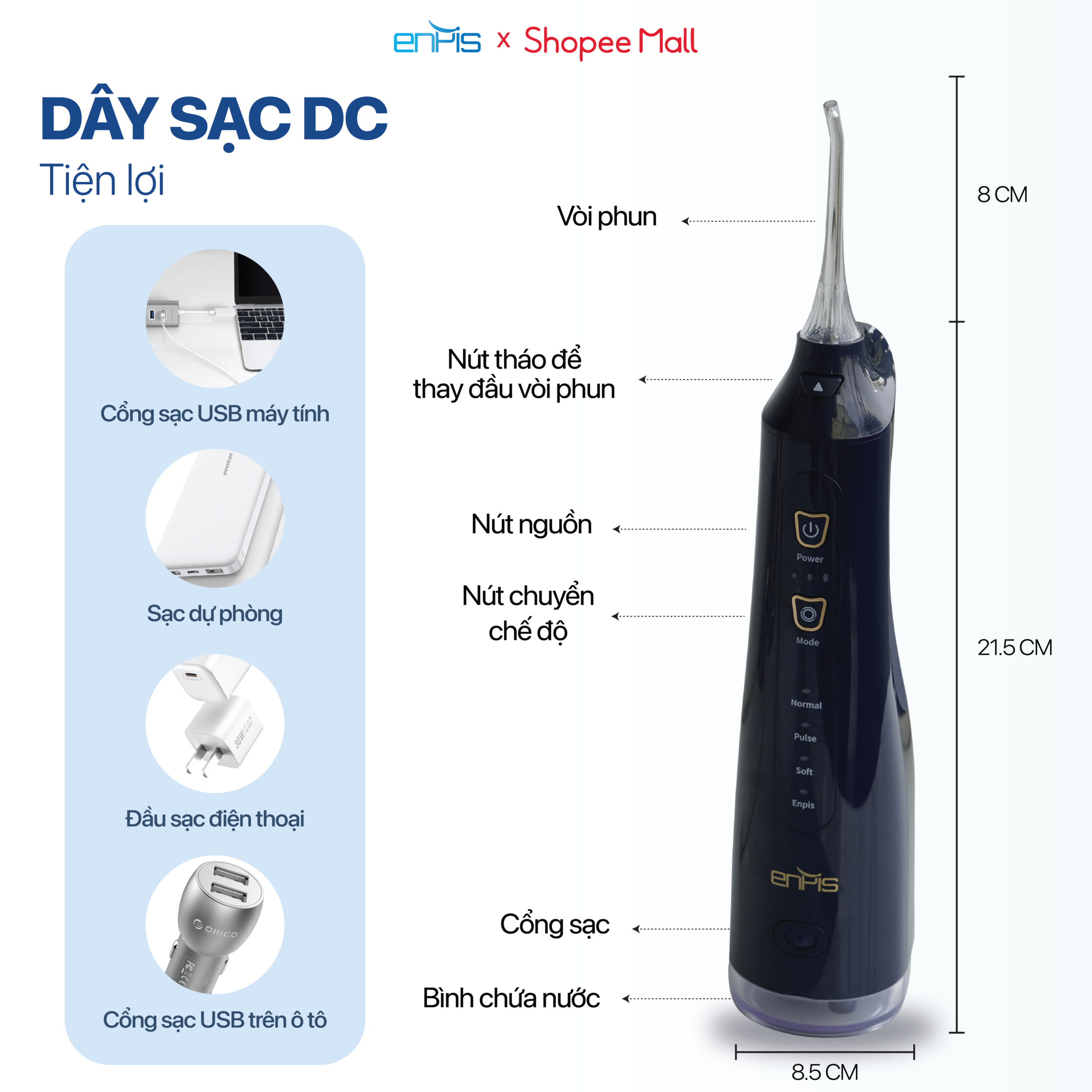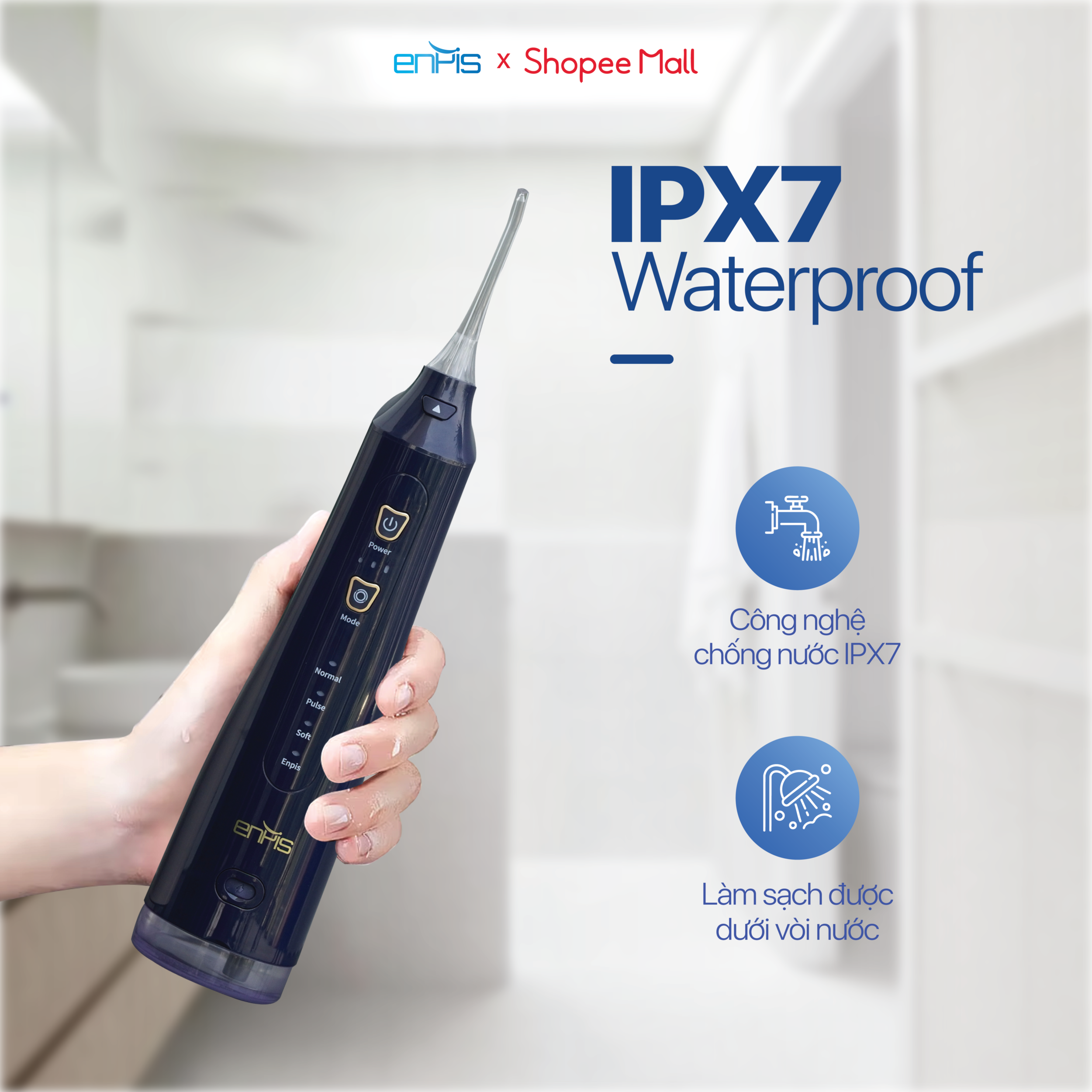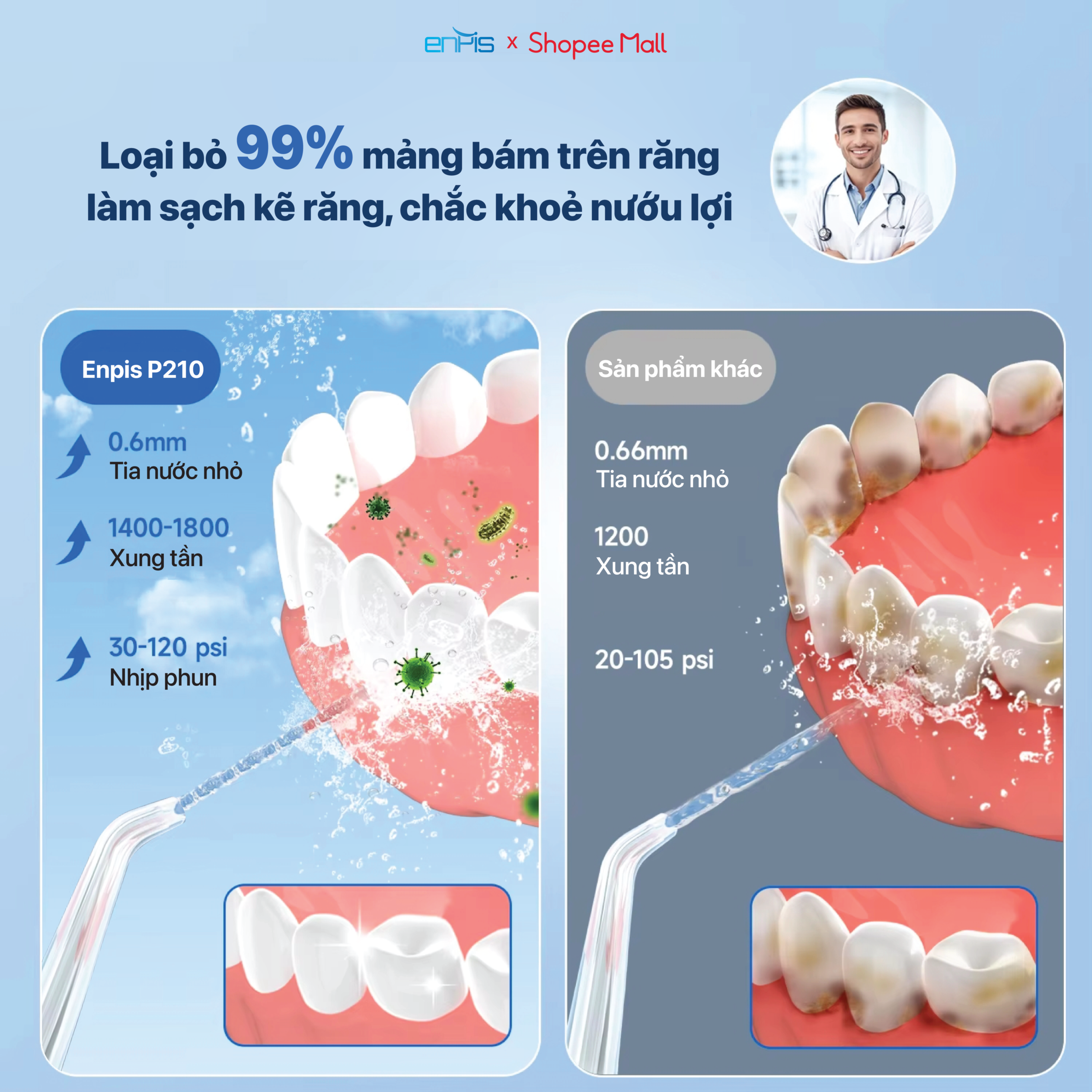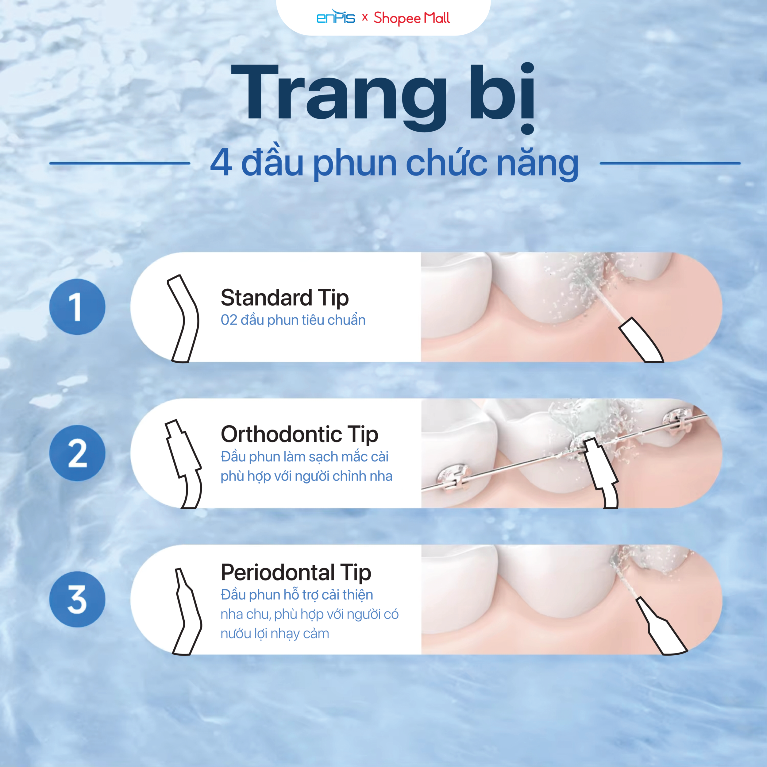 – Enpis được tích hợp sẵn nhiều chế độ giúp làm sạch chuyên sâu khoang miệng, loại bỏ mảng bám trên răng, massage nướu hiệu quả, giảm tình trạng chảy máu nướu chân răng, ngăn ngừa hôi miệng và có hiệu quả tuyệt vời với các bệnh nhân chỉnh nha, Imphant và các phục hình răng giả…